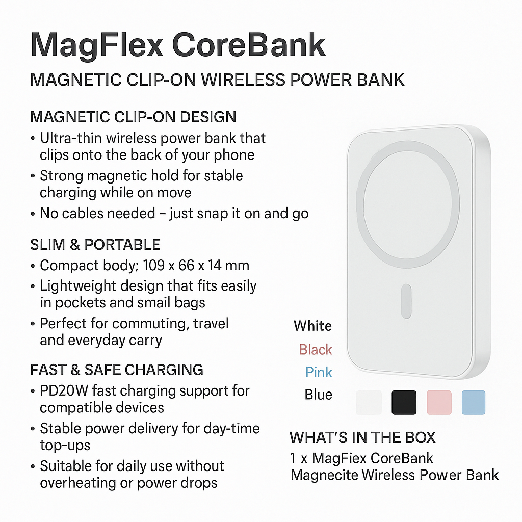 • 1 × MagFlex CoreBank Magnetic Wireless Power Bank