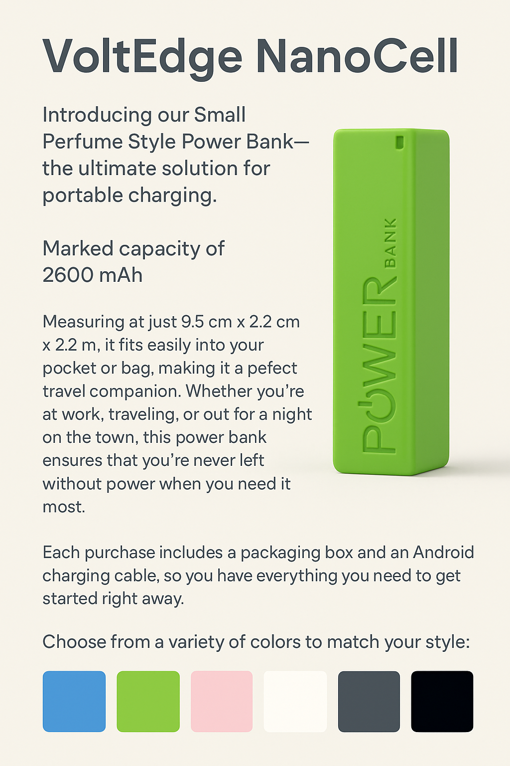 Introducing the VoltEdge NanoCell, a compact and stylish power bank designed for everyday portability.