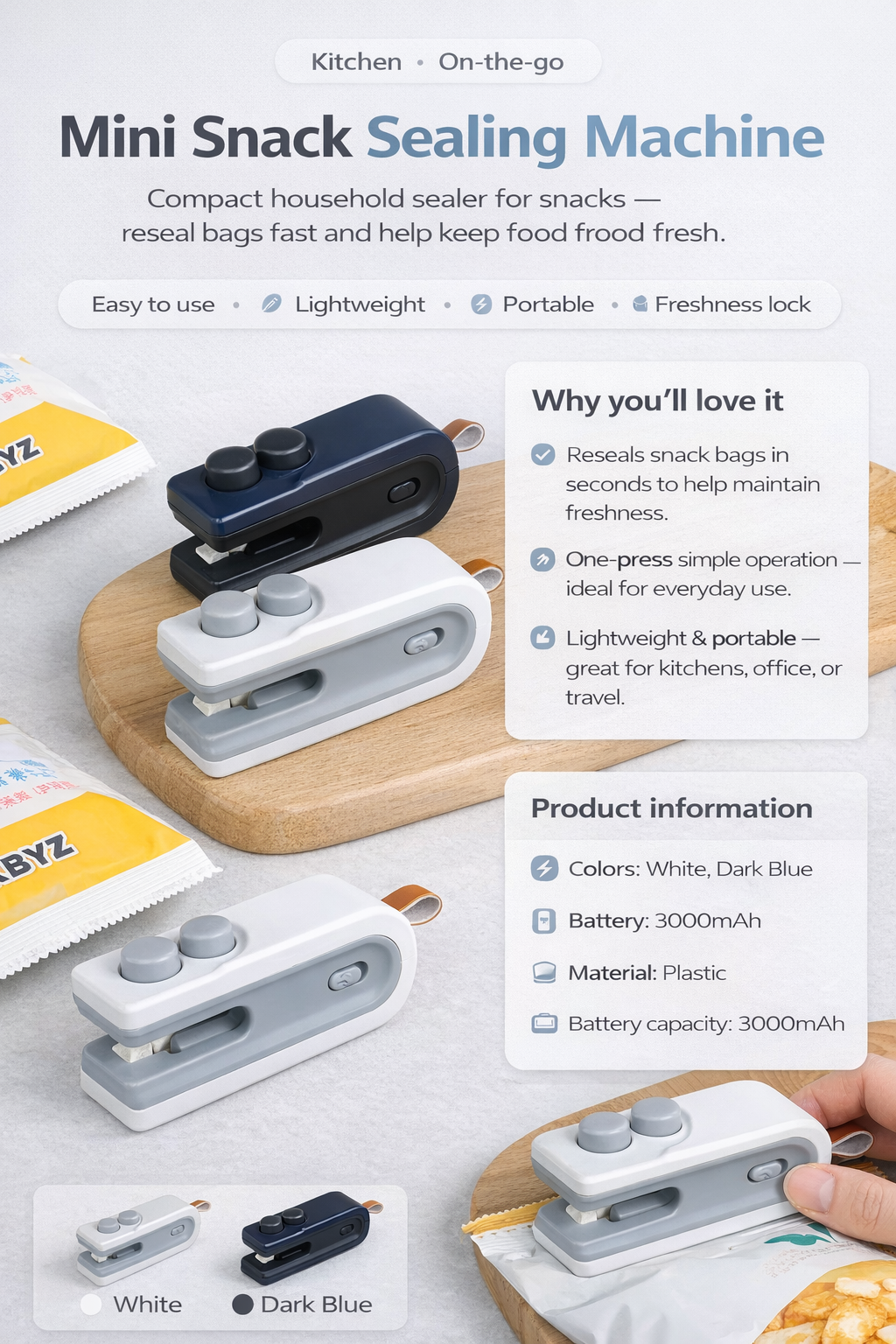 Compact household sealer for snacks with an easy-to-use design to reseal bags and help maintain freshness.