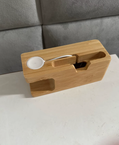 It holds my iPhone and Apple Watch neatly, and it looks really classy on my desk. The finish on the wood is smooth and premium. No more messy cables or scrambling to find my charger at night. Everything has its spot now.